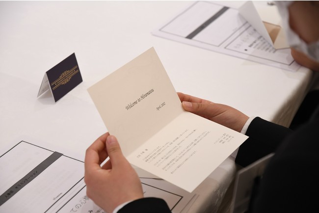 入社オリエンテーションを終えた後、会場は一転。前方スクリーンにはレストランの支配人が一通の招待状をスタッフに託している映像が流れます。するとそのスタッフが実際に会場に現れ、新入社員一人ひとりに名前入りの招待状を手渡しました。新入社員が初日の「DAY1」 で体験するのは、シェフと支配人から贈られたサプライズランチです!