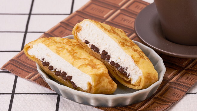 もちもちとした食感のクレープ生地でホイップクリームとチョコチップを包み込みました。