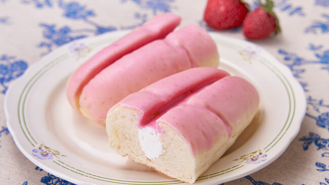ロールパンにホイップクリームをサンドし、甘酸っぱい苺チョコをコーティングしました。