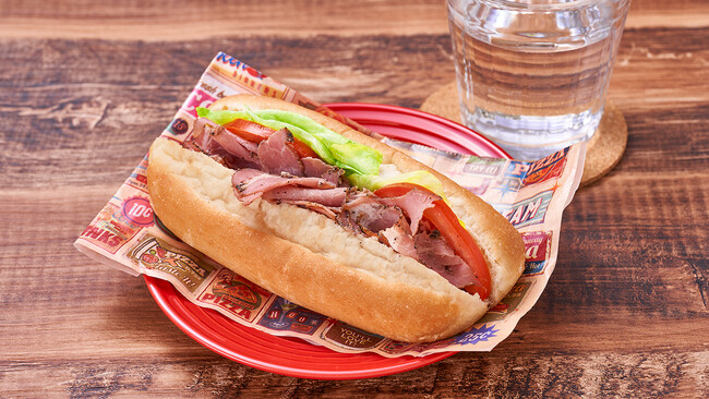 パストラミポークとトマト・レタスをサンドし、オニオンマヨソースで仕上げました。