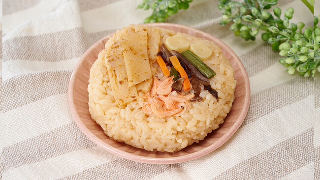 茶飯に竹の子の土佐煮、山菜、紅えびをトッピングした、春を感じるおにぎりです。