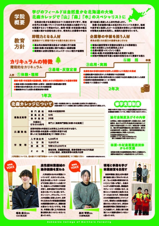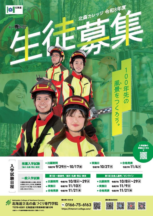 北海道の林業・木材産業の即戦力となり、将来的に企業等の中核を担う人材を育成する「北海道立北の森づくり専門学院(略称:北森カレッジ)」(北海道旭川市)では、令和8年度以降の生徒募集に向けて、次のとおりオープンキャンパス及び学院説明会を実施します。