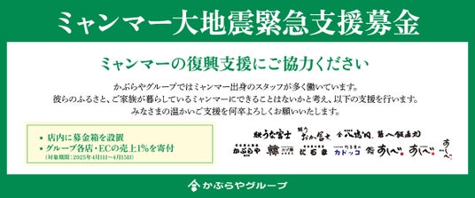 愛知県を拠点に「炭焼 うな富士」「第八飯場丸」「名古屋大酒場 だるま」などを運営する株式会社かぶらやグループ(本社:名古屋市中区千代田、代表取締役社長:榎本 渉)は、2025年3月28日(金)にミャンマーで発生した大地震を受け、被災地の一日も早い復興を願い、店頭募金活動および売上の一部を寄付する支援活動を実施しました。グループ店舗の売上の1%を、国際支援団体へ289万4767円を寄付いたしました。