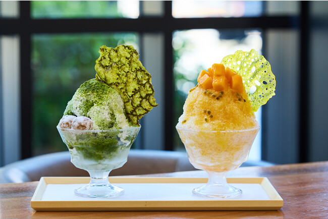 ペストリー ショップでは、毎年好評のかき氷をシェフこだわりのアレンジにて2種類お届けいたします。高糖度ですっきりとした甘さが特徴の宮古島産のマンゴーとパッションフルーツを使ったフルーティーなかき氷は、マンゴーを贅沢に1/2個使用し、甘酸っぱくすっきりとした後味に仕上げた夏にぴったりの一品です。別添えのココナッツソースをかければ、甘くコクのあるミルキーな味わいが広がり、より一層南国気分をお楽しみいただけます。抹茶とマスカルポーネのかき氷は、上質な宇治抹茶のほろ苦さを活かしたホテルメイドの濃厚な抹茶シロップとマスカルポーネクリームの優しい味わいが織りなすハーモニーが絶妙です。氷の中には小豆を、トッピングには抹茶チュイルや黒糖わらび餅をアレンジし、別添えに黒糖シロップもご用意しました。