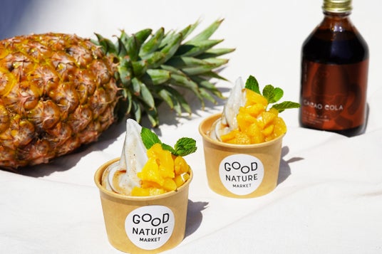台湾産の“芯まで食べられる”パインを主役に、施設オリジナルの『アップサイクルコーラ(カカオハスク使用)』をソースとして使用したソフトクリームを販売。廃棄を減らしつつ美味しさも追求した“食から始めるGOOD”。