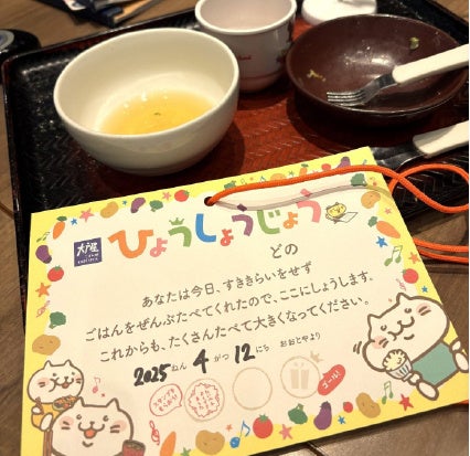 ご注文いただいたお子様メニューのうち、いずれか1品を残さず完食されたお子様に、店舗から表彰状をお渡しする、食べきり応援企画です。さらに、チャレンジを3回達成し、スタンプを集めると、廃棄野菜を再活用して作られた大戸屋オリジナルの「大戸屋やさいクレヨン」をプレゼントいたします。