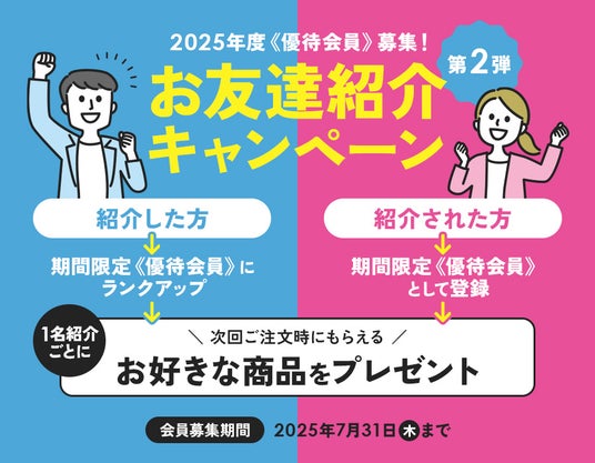 アイメディア公式WEBショップでは現在、期間限定の〈優待会員〉様を募集しています。アイメディア公式WEBショップに会員登録をしていただきお友達を紹介すると、期間限定の〈優待会員〉にランクアップ!紹介した方&された方の両方に、次回ご注文時にお好きな商品をプレゼントするお得なキャンペーンを実施中です。すでに会員登録をされている方もご参加いただけます。キャンペーン詳細は下記キャンペーンサイトよりご確認ください。