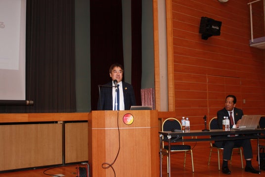 ▲当社による講演の様子 ※講師:食品カンパニー長 星野 裕之(右)食品カンパニー 営業部長 吉田 慎介(左)