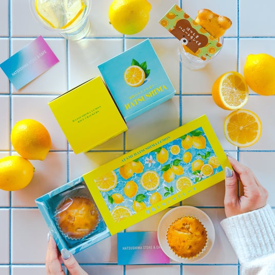 「初島レモンマドレーヌ」のパッケージはレモンと海のコントラストで、島で過ごした爽やかな思い出を呼び起こすようなビジュアルに。販売開始から1か月で1,500個分を売り上げる人気商品となっています。