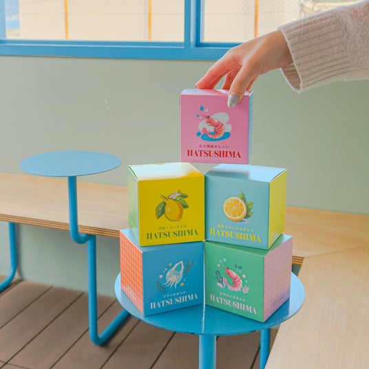 “初島の自然の宝石箱”をイメージした、手のひらサイズのキューブ型ボックス。海老、いか、レモンなど、初島ならではの食彩をテーマにした5種類で、SNS映えする見た目と手軽さが人気を集めています。
