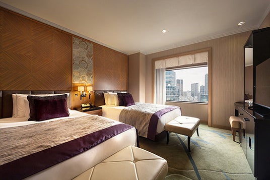 ベッドがツインタイプのアンバサダースイート。 快適なバスタイムのために、レインシャワーに加えてテレビをご観賞いただけます。