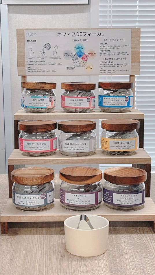 SPILA TEA TOKYOの和漢茶は、漢方からハーブ、紅茶まで幅広い種類、商品を取り扱っており、奈良県下市町にある創業160年の老舗から仕入れた高品質な生薬を使用しています。その和漢茶をより身近にするために、「オフィスDE和漢茶」として、オフィスの一角に和漢茶コーナーを設け、従業員が好きなときに好きなだけ和漢茶を飲むことができます。