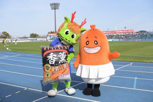 「おいしさ」で水戸ホーリーホックを征服しに、あらびき星から今年も「ソップリン」がスタジアムに来場!試合前にソップリンとホーリーくんと一緒にフォトセッションを行います。