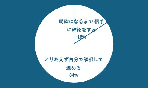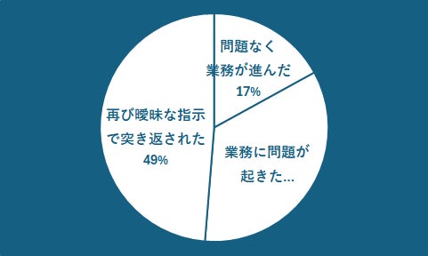 調査の結果、88.1%が「曖昧な指示を受けた経験がある」と回答。それにもかかわらず、そのうち84.2%が「確認をせず自己判断で対応している」ことが判明しました。その結果、48.7%が 「再指示が入った」、34.3%が「業務に支障が出た」と回答しました。