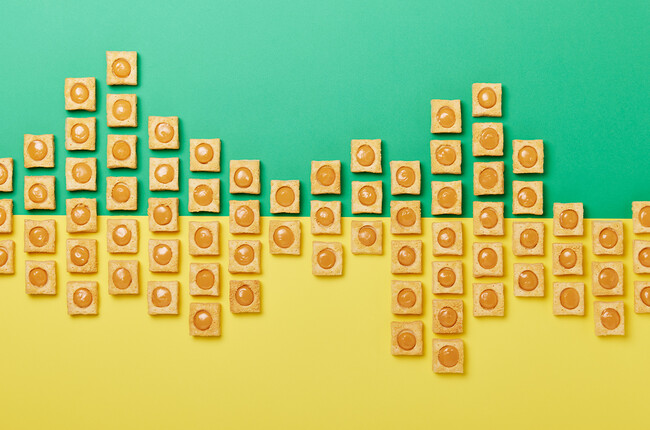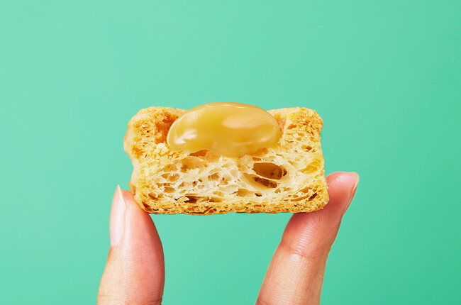メインプロダクトの「山ノチーズパイ」は、512層からなるチーズパイに北海道十勝産のパルメザンチーズをひと振りして焼き上げ、チーズの香るパイ生地の中央にはバターを作る過程で生まれる副産物であるバターミルクパウダーとチェダーチーズパウダーを加えたチーズクリームを乗せました。ひとくち頬張ると、サクサクしたパイ生地とミルクのうまみを感じる優しいチーズクリームが口の中で広がります。