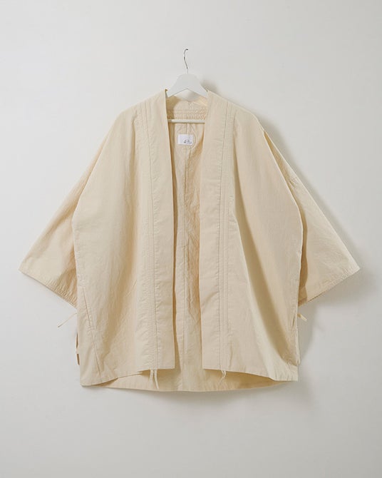 “土に還る服” Syncsとのコラボレーションアイテム。日本の伝統衣装の1つでもある「法被はっぴ」から着想を得てうまれました。法被らしい要素を残しつつ、現代のスタイルに合わせたデザインが特徴で襟元や裾などにあるドローコードで着用感を自在にアレンジいただけます。