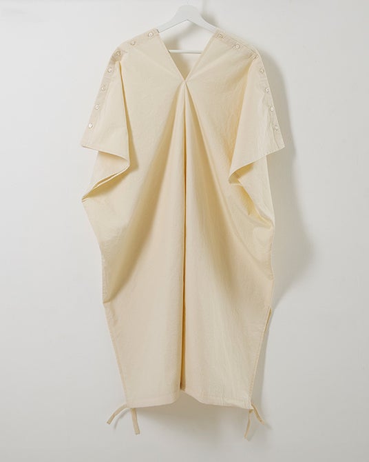 昔の日本でも着られていた「貫頭衣」から着想を得たワンピースは、裁断時のハギレが少なくなるようあえて直線的なパターンでデザインすることで、様々な着こなしのアレンジもお楽しみいただけます。