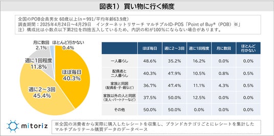 最初に「買い物に行く頻度」を調査したところ「ほぼ毎日」が40.3%、「週に2~3回」が45.4%となり、全体の約86%が週に複数回買い物に出かけていることがわかりました。同居状況別にみると「一人暮らし」の人では「ほぼ毎日」が48.6%と最も高く、日々の買い物が生活の一部として定着している様子がうかがえます。一方で「配偶者と二人暮らし」や「家族と同居」の人では「週に2~3回」が47.4~47.9%で最多となっており、家族構成によって買い物の頻度にも差があることがわかります(図表1)。