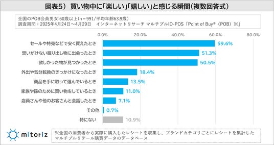 「買い物中に楽しい・嬉しいと感じる瞬間」について調査したところ、「特にない」と回答した人は10.9%にとどまり、約90%の人は何らかのポジティブな体験をしていることが明らかになりました。最も多かったのは「セールや特売などで安く買えたとき(59.6%)」、次いで「思いがけない掘り出し物に出会ったとき(51.3%)」、「欲しかった物が見つかったとき(50.5%)」が上位に続き、買い物における“お得感”や“偶然の発見”が喜びにつながっている様子がうかがえます。また「外出や気分転換のきっかけになったとき(18.4%)」や「商品を手に取って選んでいるとき(13.5%)」など、買い物の過程そのものを楽しんでいる人も一定数存在しています(図表5)。