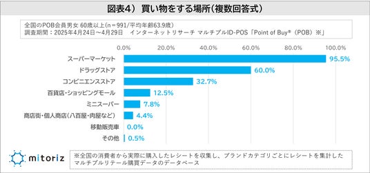 買い物先は「スーパー」が95.5%で一強、次点は「ドラッグストア」で「コンビニ」の1.8倍に