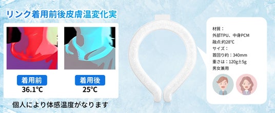 このリングには、体温調節素材として注目を集めるPCM(相変化素材)を採用。周囲の温度が高くなっても、自らの温度を一定に保つ特性があり、持続的な冷却が可能です。