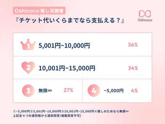 1番大きい割合を占めた「5,001円~10,000円」は、国内アイドルのチケット代の相場に近くなっています。国内アイドルやアーティストはコンサート・ライブ数も多く、1万円以内のチケット価格が主流であるためこの金額帯が妥当だと考える推し活層が多かったようです。