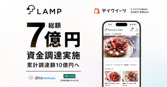 飲食店やスイーツ店を中心に全国2,500店舗以上へ導入のテイクアウトの注文受付・管理SaaS「テイクイーツ」を提供する株式会社ランプ(本社:京都市中京区、代表取締役:河野 匠)は既存投資家であるDNX Ventures、三井住友海上キャピタルを引受先とした第三者割当増資により、総額7億円の資金調達を実施いたしました。