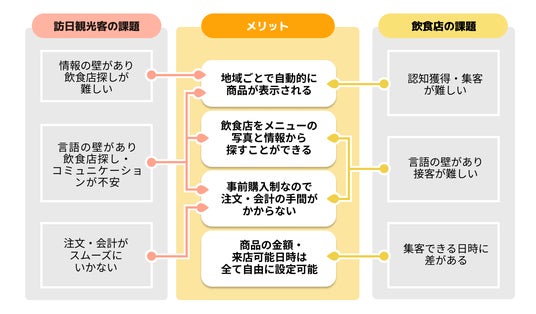 また、飲食店としても集客手段がなく訪日観光客の皆様に認識してもらえない点や、言語対応ができておらず、 注文・会計時にトラブルが発生する可能性も非常に高くある点、特定の時間や曜日における稼働が低く、空席の時間ができてしまう点などの課題感を抱えています。