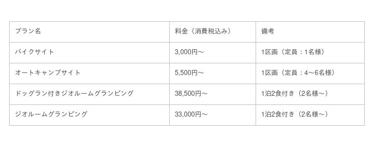 用途にあわせた各サイトのほか、食事がセットになったグランピングプランもご用意しております。