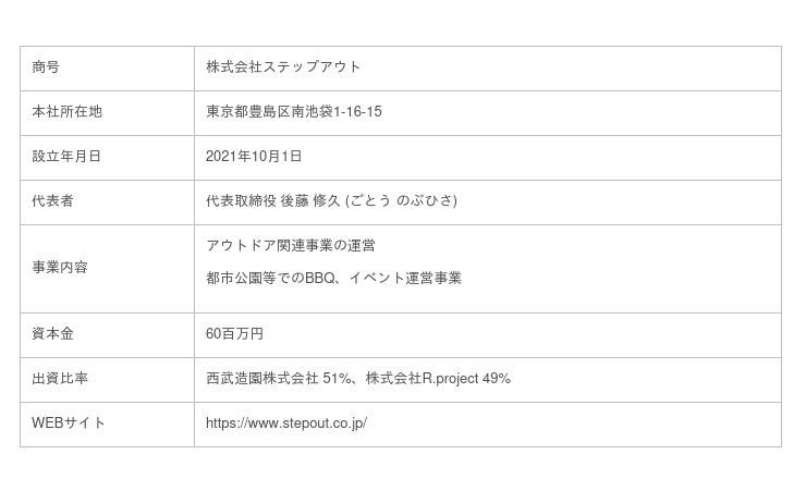 西武グループの造園・緑地事業専門会社である西武造園は、ウィズコロナ、アフターコロナの社会において、アウトドア事業は高い付加価値を創出できる有望な事業領域と判断し、アウトドア業界の DX のトップランナーである R.project と提携。2021年10月に、同事業を推進する合弁会社として株式会社ステップアウトを設立いたしました。
