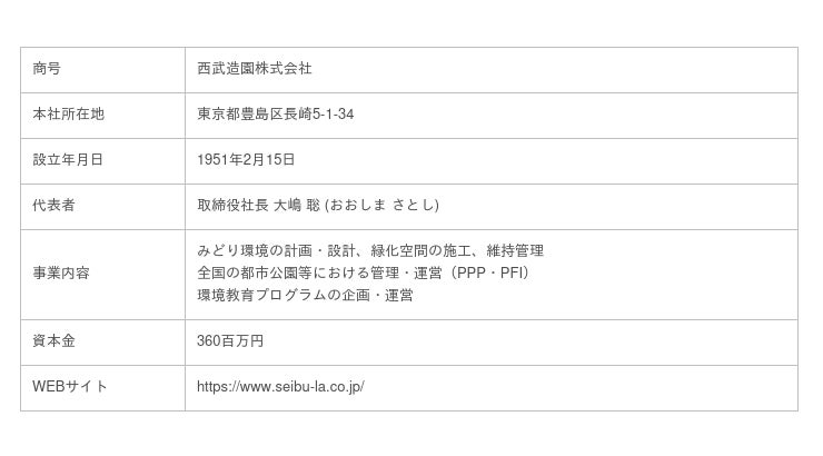 西武グループにおける「造園・緑地事業専門会社」として、設計・施工・維持管理・運営までワンストップなサービス『みどりの総合プロデュース』を全国で展開し、“人”と“みどり”のより豊かで、魅力あるまちづくりに寄与・貢献しています。