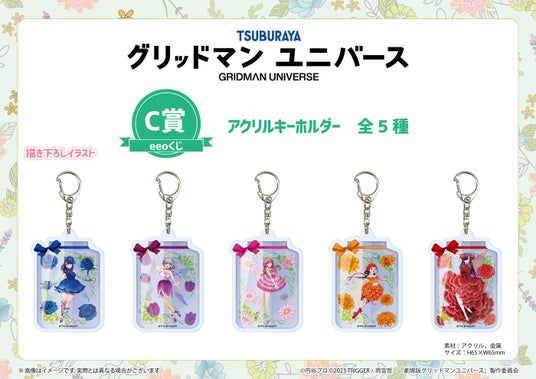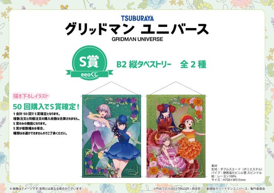 今回発売した『グリッドマンユニバース』の「eeoくじ」の中で、一番レアなS賞はB2縦タペストリー! 大きさおよそ縦73cm×横52cmとビッグサイズで、壁に飾れば色鮮やかな花の美しさとともに、お部屋いっぱいにキャラクターたちの可愛さが広がること間違いなし♪