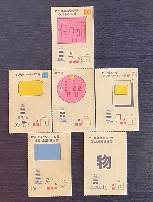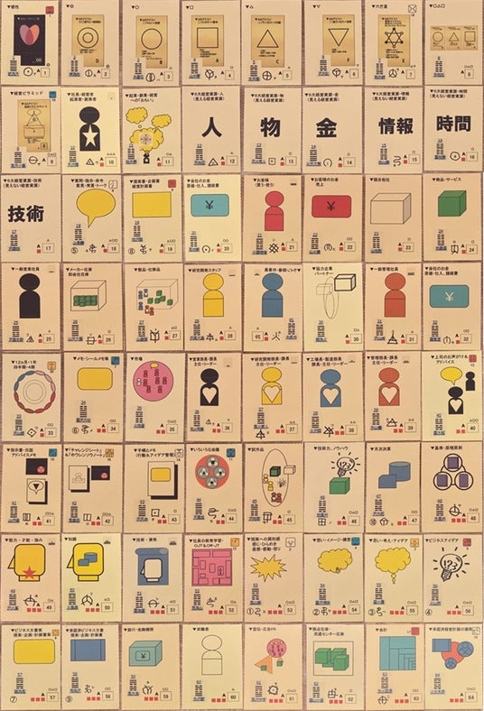 下の写真のようなカードを使って進めて行きます。経営の大事な要素を64項目に絞り、その項目をカラフルでシンプルなアイコンにして制作してあります。