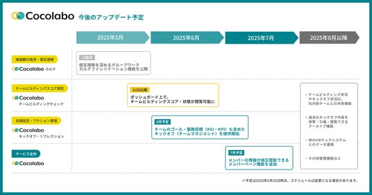 Cocolaboでは、チームビルディングを担うマネージャー・リーダー・管理職の方々がチームビルディングを円滑に推進できるよう、2025年7月まで毎月機能を順次アップデート予定です。2025年5月7日公開のCocolaboカルテ(相互理解促進ツール)のアップデートを皮切りに、6月・7月には「キックオフ」機能の改善など、チームの目標設定やアクション管理を支援する新機能も追加を予定しております。