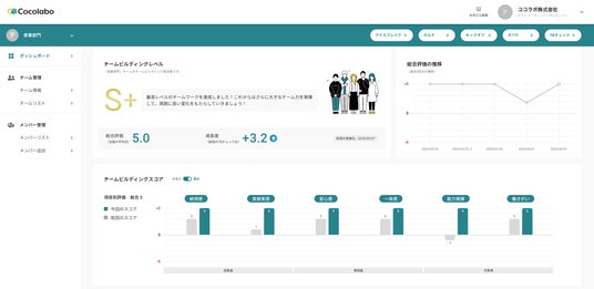 メンバーの回答から集計された結果から、チーム状態の総合評価が、S+からD-までの15段階でレベル表示されるようになります。合わせて、総合スコアと成長度もわかるようになります。