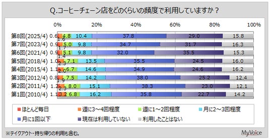 マイボイスコム株式会社(東京都千代田区、代表取締役社長:高井和久)は、8回目となる『コーヒーチェーン店の利用』に関するインターネット調査を2025年4月1日~7日に実施しました。