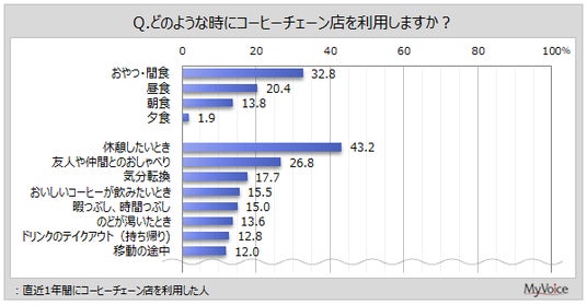 直近1年間にコーヒーチェーン店を利用した人の利用場面は(複数回答)、「休憩したいとき」が43.2%、「友人や仲間とのおしゃべり」が26.8%です。「おやつ・間食」は32.8%、「昼食」は20.4%です。