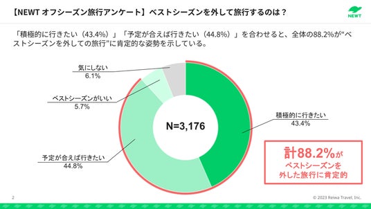 次に、ベストシーズンを外して旅行することへの意識を尋ねたところ、「積極的に行きたい(43.4%)」「予定が合えば行きたい(44.8%)」を合わせ、88.2%がベストシーズンを外した旅行に肯定的な回答を示しました。これは、かつての”旅行シーズンの一極集中”が変わり、人混みや価格を避けたスマートな旅行スタイルが新常識になりつつありそうです。