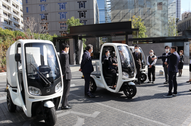 そのタイトルの通り「新しい話題のEVを実際に体験してみよう」という趣旨でスタートした同社の勉強会は、今回が第2回め。同社のある麹町ガーデンタワーの車寄せには、対象となったI-Cargoプロトタイプが3台集結しました。