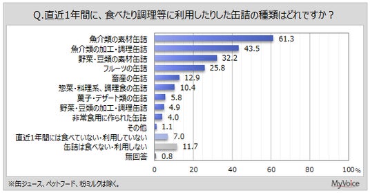直近1年間に食べたり、調理に利用したりした缶詰の種類は(複数回答)、「魚介類の素材缶詰」が61.3%、「魚介類の加工・調理缶詰」が43.5%、「野菜・豆類の素材缶詰」が32.2%です。