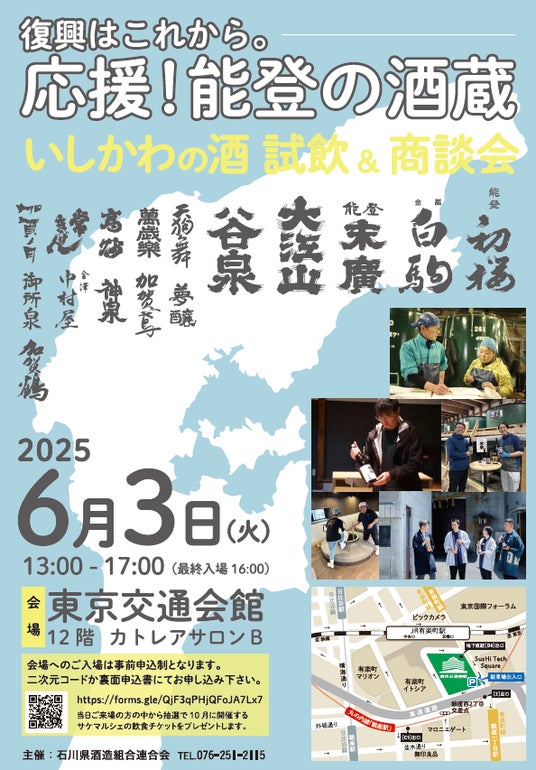 石川県酒造組合連合会(石川県金沢市、会長 車多一成)は、2025年6月3日(火)、東京都千代田区有楽町の東京交通会館で、能登を所在地とする5蔵を含む、石川県酒造組合連合会加盟の16蔵が一堂に会する業界関係者向けの試飲&商談会を開催いたします。