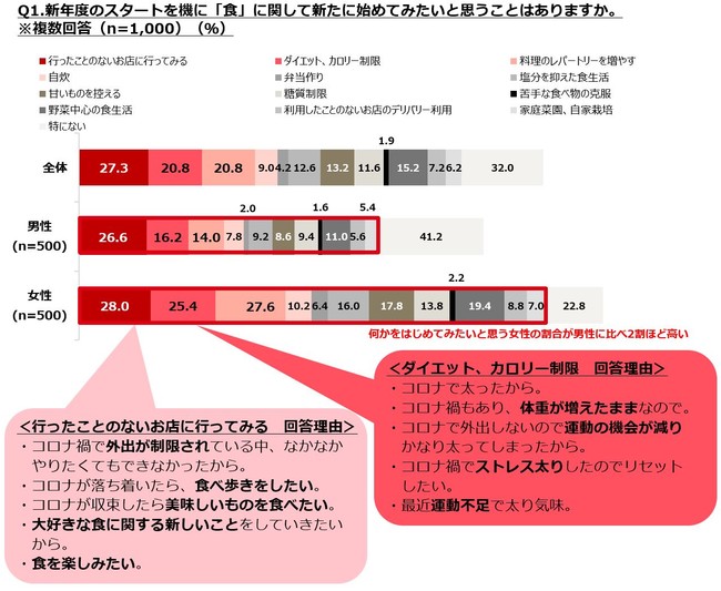 ・新年度のスタートを機に「食」に関して新たに始めてみたいと思うことは、「行ったことのないお店に行ってみる」が約3割で最も多く、次いで「ダイエット」「料理のレパートリー増やす」が約2割と続く。新たに何か始めたいと思っている女性は8割弱、男性より2割程度高い傾向。