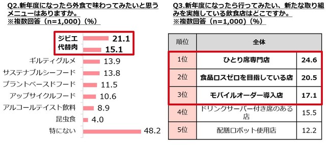 コロナ禍で迎える3度目の新年度。生活環境の変化とともに、食に関する意識にも影響が出ているようです。調査では、新年度に「食」に関して新たに始めてみたいことを聞いたところ「行ったことのないお店に行ってみたい」と、約3割の方が回答。コロナ禍でなかなかできなかった“飲食店の新規開拓”を切望している方も多いようです。また、行ってみたいと思う飲食店や味わってみたいメニューについて、「ひとり席専門店」「モバイルオーダー導入」など、コロナ禍で注目された新たな飲食店スタイルやDXの取り組み、また、「食品ロス」「ジビエ」「代替肉」といったSDGs関連のキーワードに注目が集まりました。