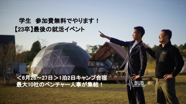 新型コロナウイルス感染拡大の影響により、企業と学生が直接出会える機会が減少しています。就職を希望する学生と企業を三密回避になるアウトドアな空間を通じて直接の出会いの機会を提供することで、いつもとは違った感覚や発想を生み、新しい学びの体験になるとともに、新たな就職・採用活動の場を創出します。 株式会社BUBが運営する非日常体験リゾート「BUB RESORT」で、非日常な体験と共に自己理解と、本当の自分にあった企業選びを提供します!