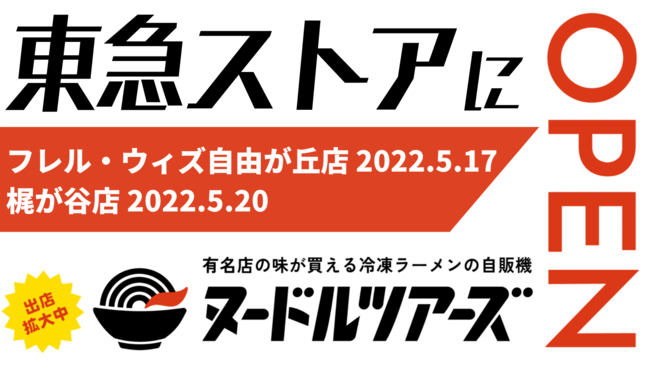 業務用麺類製造を行う株式会社丸山製麺 (本社:東京都大田区、代表取締役:丸山 和浩、以下「丸山製麺」)が運営する、日本初の東京の有名店のラーメンが購入できる冷凍自販機「ヌードルツアーズ(https://noodle-tours.com/)」が、株式会社東急ストア(本社:東京都目黒区、代表取締役社長:大堀 左千夫)が展開するスーパーマーケット「東急ストア」のフレル・ウィズ自由が丘店および梶が谷店にて販売を開始します。ヌードルツアーズを通じて、東急ストアへ買い物に来られたお客さまのサステナブルでより豊かな生活の実現に貢献します。