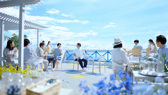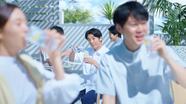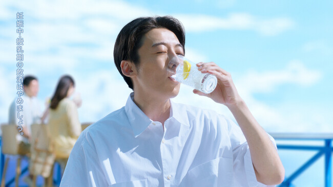 キラキラの海と晴れ渡る空が気持ちのいいテラスで、周りの人たちが「氷結(R)無糖」を楽しんでいることに気が付く高橋一生さんは、「あ~、とうとう見つかっちゃったか、『氷結(R)無糖』。ちゃんとおいしいもんなぁ~…飲めばわかっちゃうもんなぁ~」と心の声で語り、すっかり人気者の「氷結(R)無糖」を思ってちょっぴりさみしいながらもうれしそうな表情になります。自分のグラスにも「氷結(R)無糖」を注いでゴクゴクッと飲むと、思わず「おいしいもんなぁ~!」と声に出してしまいます。隣の席から「ですよね」と相槌があると、心の声が漏れていたことに「あっ…!」と照れてしまうものの、みんなが「うんうん」とうなずいていることに気が付き、うれしい笑顔を浮かべるのでした。「今、チューハイは無糖がおいしい」のメッセージのように、「氷結(R)無糖」の人気ぶりが伝わってくるシチュエーションと、高橋さんの表情の変化や気持ちのいい飲みっぷりにもご注目ください。