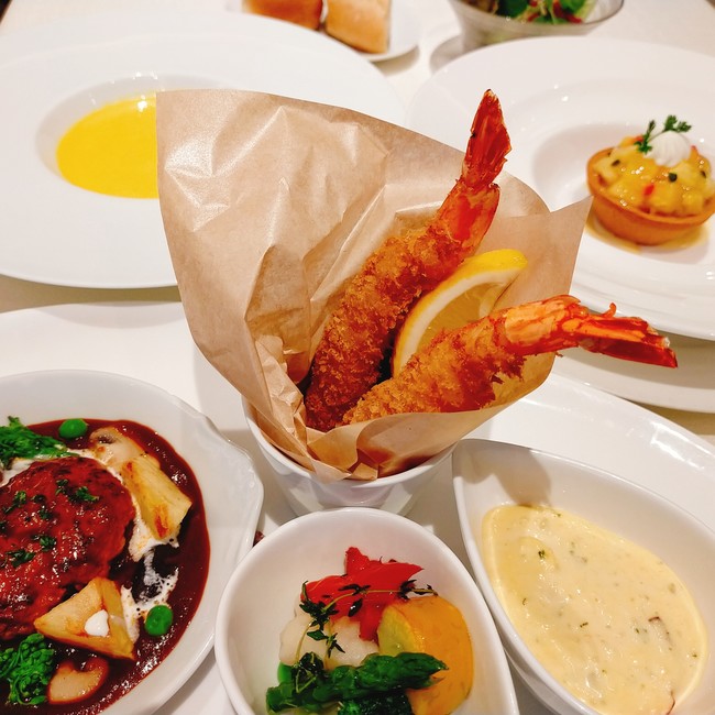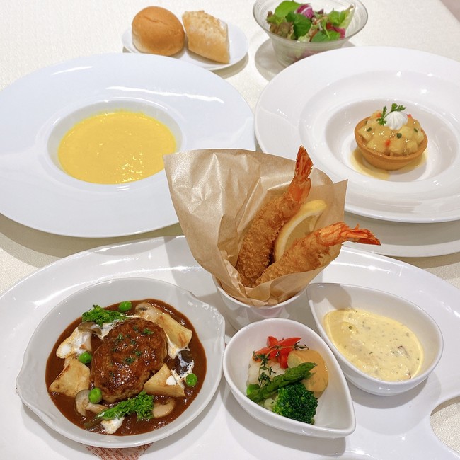 第一弾は6月1日(水)~15日(水)で、メイン料理が煮込みハンバーグとエビフライです。じっくり煮込んだハンバーグと、サクサクでプリプリの大きなエビフライは当レストランで人気のメニューです。