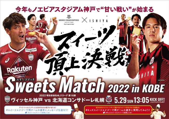 「ヴィッセル神戸 」オフィシャルトップスポンサーの株式会社シュゼット・ホールディングス(本社:兵庫県西宮市、代表取締役社長:蟻田剛毅)が展開する洋菓子ブランド「アンリ・シャルパンティエ」は、北海道コンサドーレ札幌のオフィシャルトップパートナーの石屋製菓株式会社と共に、今年も「スイーツマッチ」を開催します。