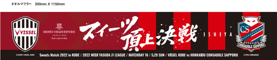 4社のロゴが入った、スイーツマッチ限定のタオルマフラーです。ぜひ、スタジアムでアピールして、ピッチで戦う選手たちにエールを届けてください。