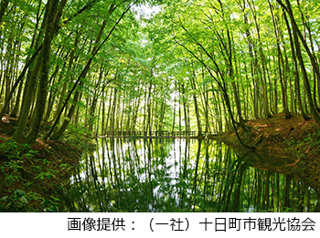 丘陵地にブナが生い茂り、木の立ち姿が美しいことから「美人林」と呼ばれる樹齢約100年のブナ林。ブナの葉の緑と幹が雨に濡れると、より美しく輝きます。また、野鳥の生息地でもあり、透き通るような鳥の鳴き声が響く美人林の中には池があり、水面に映る木々も魅力。
